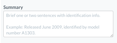 The search summary should be 1-2 sentences long, giving the most basic identifying information about the device. Remember that summaries are used in search results, so include key words or phrases you think your readers might search for when looking for help with repairing their device. Always make sure to include alternate model names/numbers, if any.
