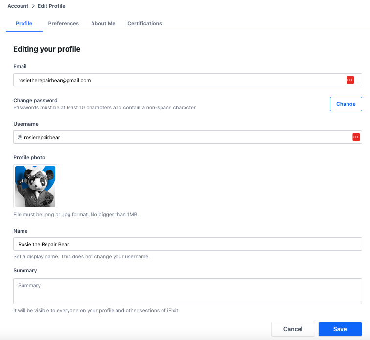 As the old adage goes, a picture is worth a thousand words. Adding images of yourself and the things that are important to you helps to contextualize the written portion of your biography and adds a human element to your profile. Think about what you want to visually communicate to employers and the iFixit community.