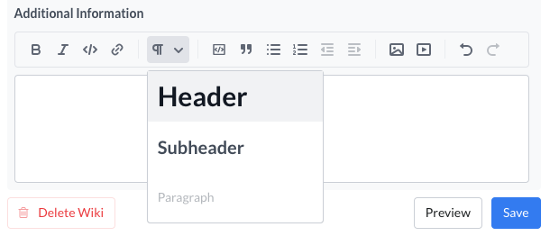 To create a properly formatted Header, highlight the text that you want to format, click on the “¶” symbol to access the drop-down menu, and select “Header.” Follow this same process to create “Paragraph” text. To create bold text, highlight your text and click on “B” on the editing toolbar. To italicize your text, highlight your text and click on the “I.” Traditional Mac and PC keyboard shortcut keys work here as well (cmd > b/i, and ctrl > b/i respectively).